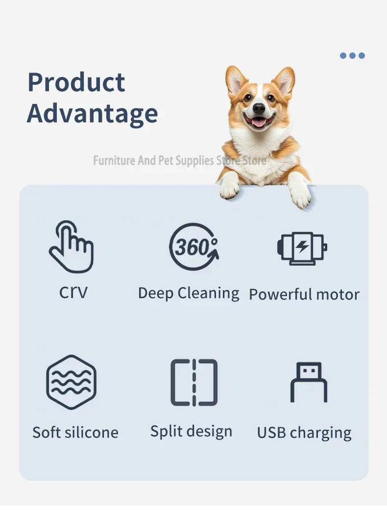 Product features: Split design, one-click cleaning, low noise, powerful motor, soft silicone, USB charging, IPX4 water resistance, 360-degree deep cleaning, high-efficiency large-capacity battery storageProduct material: ABS (outer shell) + TPR (inner lining)Target audience: Pets such as dogs and cats.